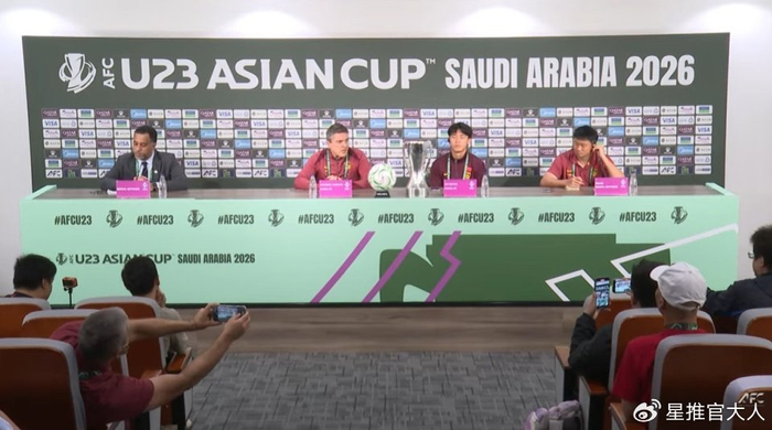 这是U23国足历史上第一次进入亚洲杯决赛。发布会现场,U23亚洲杯冠军奖杯被放在发布会的桌上,安东尼奥和胡荷韬与奖杯合影。