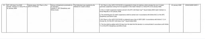 北京时间1月24日,中国队与日本队决赛打响之际,亚足联官宣了一条重磅罚单!在半决赛对阵中国队的比赛中,因为拳击中国队前锋拜合拉木的越南队后卫范理德,遭到追加处罚。亚足联给出了停赛3场+罚款1000美元的处罚。这一处罚结果,也算是给了中国队一个满意的结果。