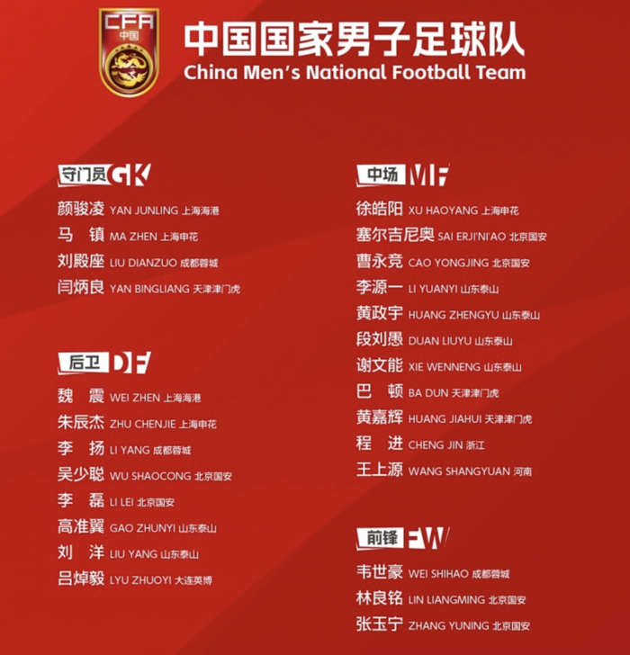 北京时间1月1日,中国足协公布了新一期国足大名单,这也是国足新帅邵佳一上任之后的首期大名单。
