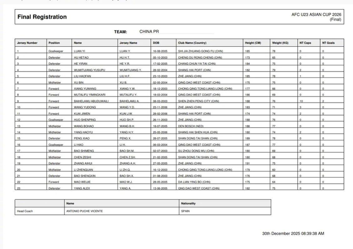U23亚洲杯将于1月7日在沙特举行,中国队参赛名单公布。
