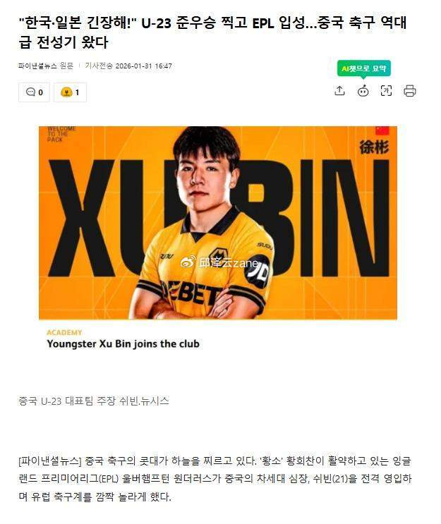 日韩媒体表示:这笔转会对中国足球具有重要意义。关键在于徐彬能否适应英超和多块速度提升自己,这一转会成为中国足球吸引欧洲市场关注的信号,一旦成功可以引发良性循环,成为中国足球发展方向转变的催化剂。U23亚洲杯亚军和登陆英超这2件事,让中国足球历史上第一次迎来前所未有的积极发展势头。中国足球努力从亚洲足球边缘走向中心,中国足球正处于历史巅峰,韩国和日本要小心了。