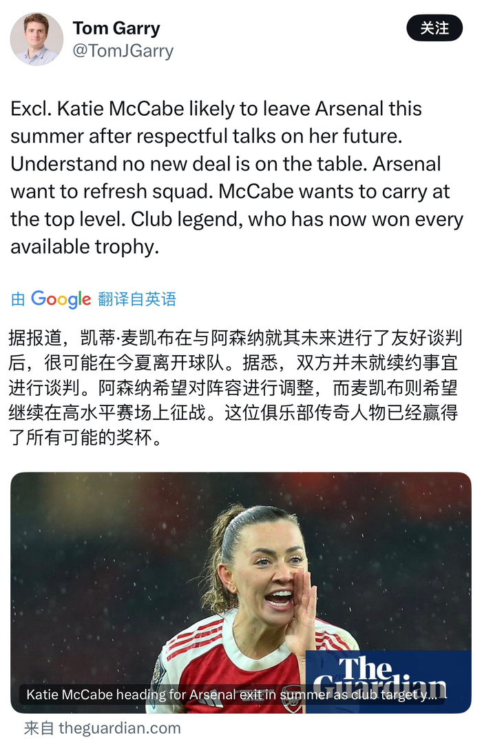 厂野有可能在今夏离开阿森纳女足