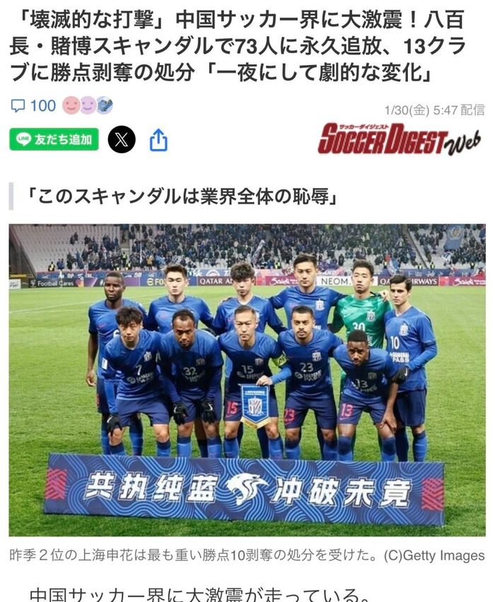 近日,中国足协公布第二批“假赌黑”处罚名单,73人被终身禁足,13支球队被罚分。对此,日本媒体进行了报道,日本球迷纷纷评论。