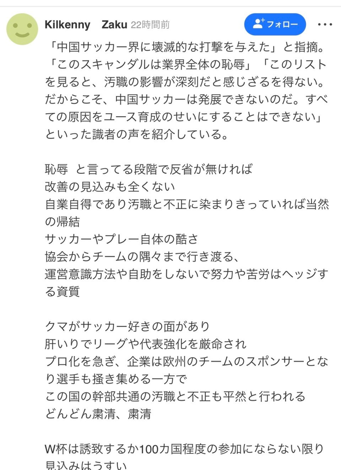 “十几年前,中超联赛请来了很多有名的选手,我当时想,不久之后日本足球就会被追赶上,所以中国足球停滞不前是不可思议的,中国U23在亚洲杯取得了一定的成果,但是如果不在这里出完脓的话,那些选手们也会腐烂的。”