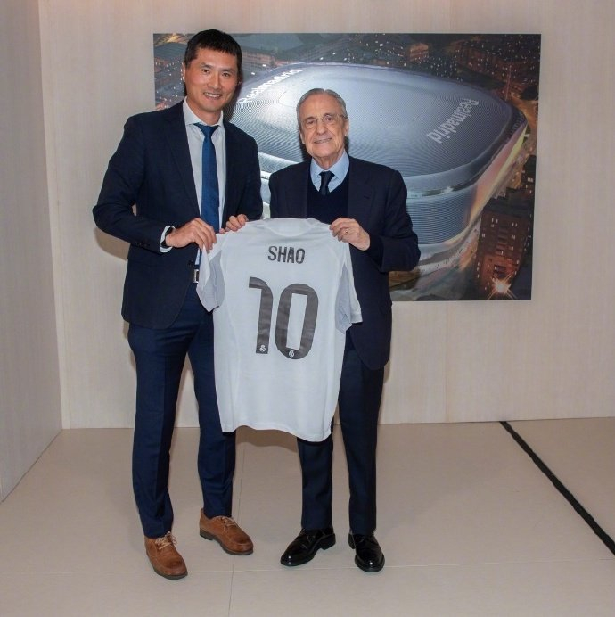 #邵佳一获赠皇马球衣# 皇马官方微博今日发文,欢迎中国男足主帅邵佳一到访。邵佳一与皇马主席弗洛伦蒂诺合影,并与平图斯进行交流。