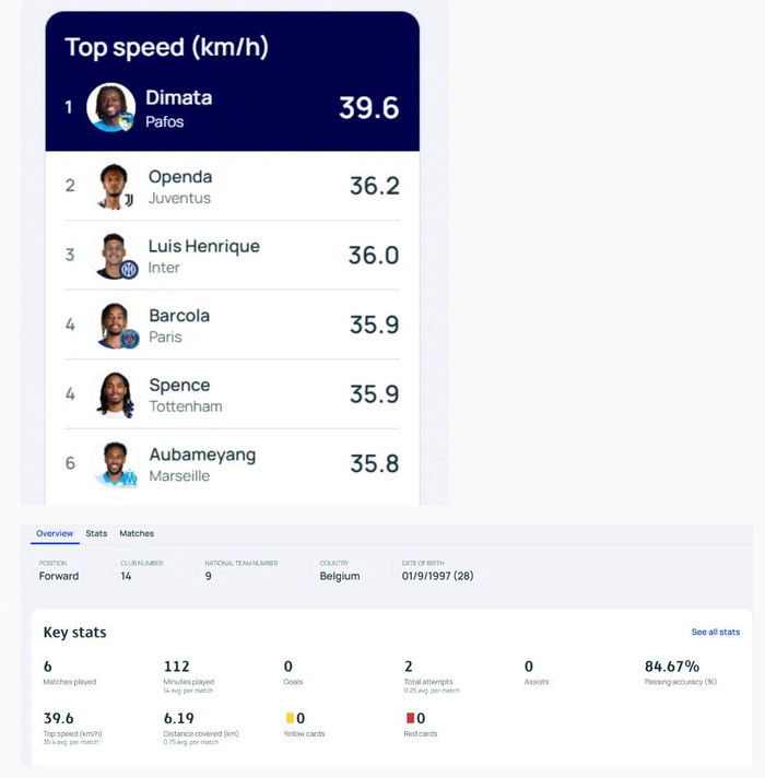 中超升班马重庆铜梁龙宣布比利时前锋迪马塔来投。值得一提的是,迪马塔最高速度达39.6公里/小时,在本赛季欧冠所有参赛球员中位列第一,力压尤文快马奥蓬达。