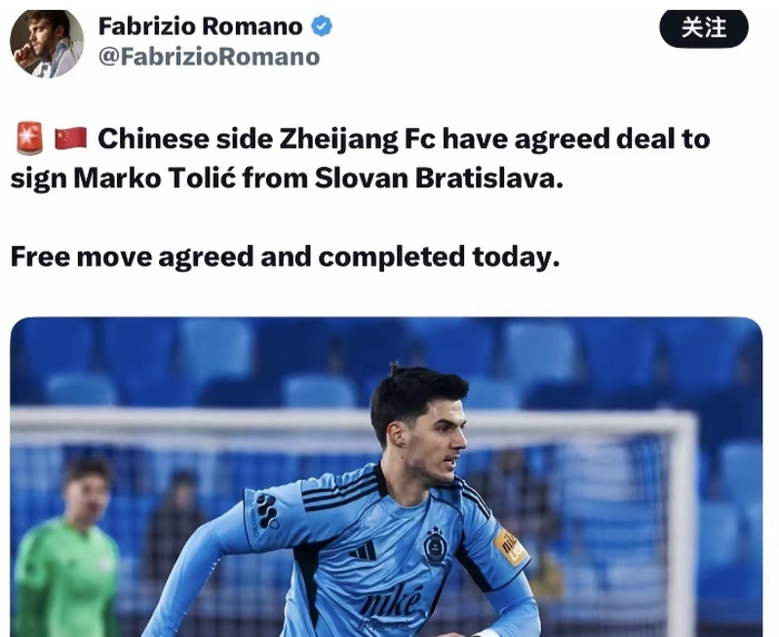 2026年2月5日,世界知名记者罗马诺报道,中超球队浙江队以免签的方式引进欧冠级别的中场外援托利奇。据了解,托利奇的转会已经达成了协议,他将离开布拉迪斯拉发队,并前往中超球队浙江队,从此开启个人在中超联赛的职业生涯。罗马诺表示,这一次浙江队和布拉迪斯拉发之间达成的是免签协议,这笔交易也会在当地时间周四(也就是咱们的周五)完成。
