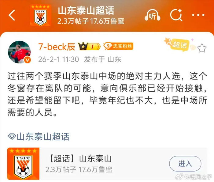 其实,泰山队在休赛期并非毫无动作,球队为了新赛季能够更好地发展,加大了对年轻球员的培养力度,因此进行了一定程度的瘦身。一些在球队中出场机会较少的球员被外租或者离队,为年轻球员腾出了成长的空间。而在近期,一则关于泰山队中场球员可能离队的消息引发了广泛关注。据某山东知名体育媒体人爆料,过往两个赛季泰山中场绝对主力人选,在这个冬窗有离队的可能,且该球员已经和意向俱乐部进行了接触。