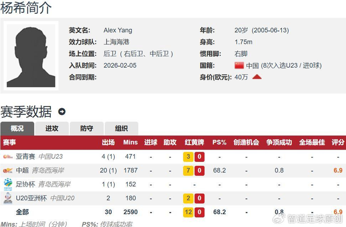 杨希现年20岁,身高1.75米,右脚球员,主打右后卫位置,是上赛季青岛西海岸的主力,上赛季中超出场21次,其中20次首发,德转估价40万欧元。