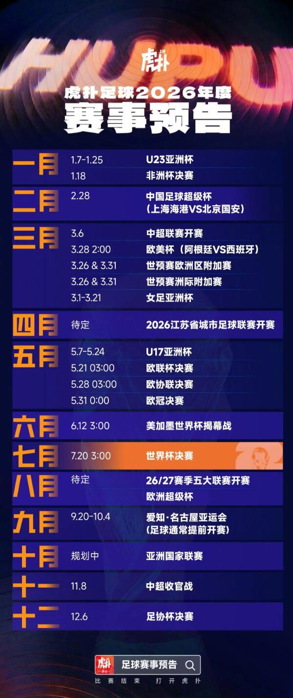 马上就将迎来全新的一年,在2026年,除了有万众期待的美加墨世界杯之外,越来越多的国内外赛事也将如火如荼地展开,虎扑为各位球迷制作了2026年足球赛历,祝各位新年快乐!