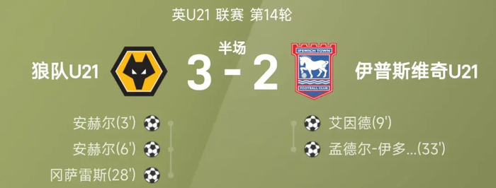 第9分钟,伊普斯维奇U21虽然扳回一球,但是第28分钟,狼队U21火速将比分扩大到3-1!第33分钟,伊多武帮助伊普斯维奇U21打进第二球,半场结束,双方战成3-2!
