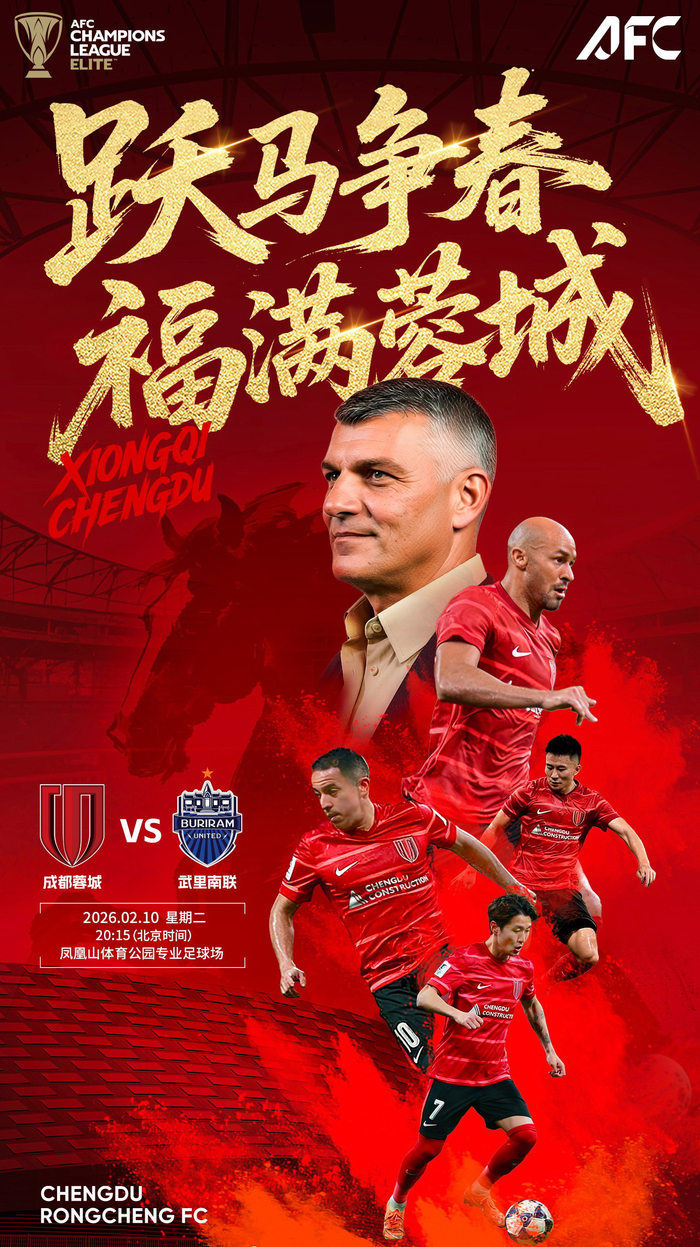 北京时间2月10日晚(今晚)20时15分,2025-2026赛季亚冠精英联赛联赛阶段东亚区第7轮的一场焦点对决在凤凰山体育公园专业足球场上演,中超新川足成都蓉城坐镇主场,迎战泰国超级联赛劲旅武里南联。