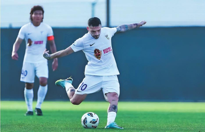 大连英博队新援斯坦丘(右)在热身赛中主罚任意球。 大连英博足球俱乐部供图