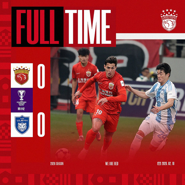 2025/2026#亚冠精英联赛# 第8轮#上海海港0比0蔚山HD#。本场比赛,新援杨希获得首发机会。比赛一开始,双方就展开激烈的拼抢。第13分钟,海港队获得机会,安永佳完成射门,可惜皮球被对手封堵。上半场补时阶段,海港队获得反击机会,可惜李新翔最后射门被封堵。上半场比赛,两队战成平局。易边再战,双方加强进攻,都获得了不错的机会,但均未转化为进球,海港队门将颜骏凌多次化解了对手极具威胁的射门。此后,海港队通过换人调整进一步加快了进攻节奏,新援张源和岳鑫也相继替补登场,其中岳鑫是加盟海港队后的首次亮相。最终双方握手言和,海港队结束了本赛季的亚冠征程。感谢现场球迷们不遗余力的呐喊鼓励,同时也感谢电视机前关注球队#全民健身# 的家人们!下一场比赛,海港队将于3月1日(周日)在南京奥体中心体育场迎来中国足协超级杯决赛,对战北京国安队。#上海海港[超话]#