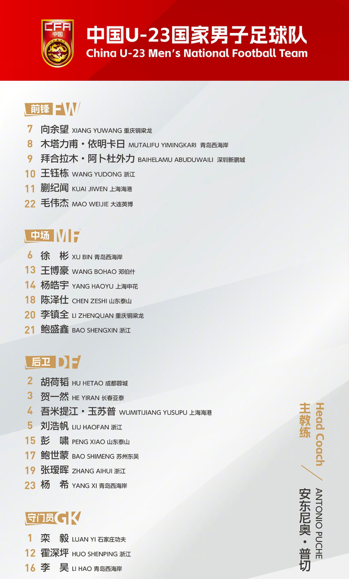 1月7日官方消息,中国队的23人参赛名单全部确定,由王钰栋、蒯纪闻、拜合拉木、胡荷韬等现役国脚领衔,另外留洋小将王博豪入选,不过朱鹏宇、依木兰、姚浩洋、张一轩落选最终名单。