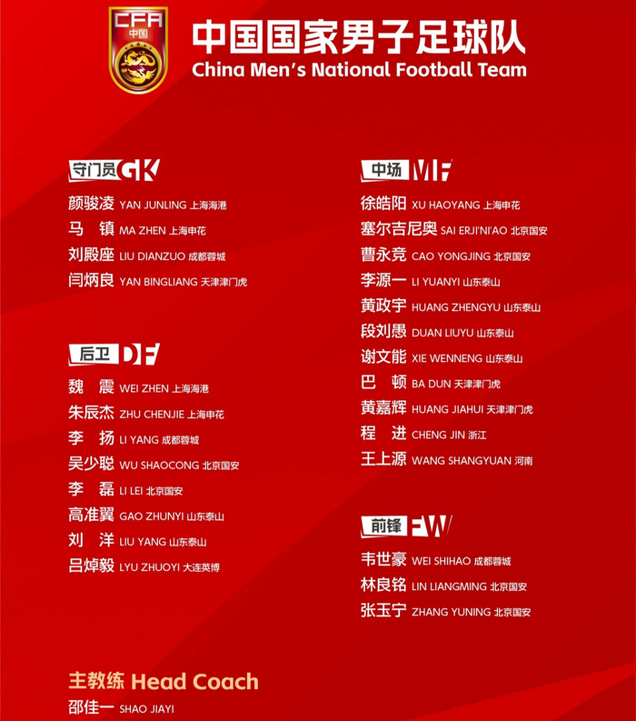 2026年1月1日,国足公布了2026年首期集训名单,总计有26名球员参加,杨智、周挺、毛雷尔等人加入了国足教练组,主教练则是本土名帅邵佳一。这一次国足的球员名单、教练组成员均发生了不小的变化:李扬、闫炳良、吕焯毅3名球员首次入选国家队,教练组则基本是之前青岛西海岸的班底,归化球员只有塞尔吉尼奥1人入选,门将则有刘殿座、颜骏凌、马镇、闫炳良4人入选。(集训具体名单如下图)