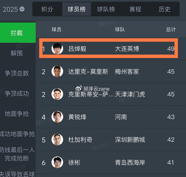 第一个,吕焯毅本赛季确实是整个中超表现最好的边后卫之一了,他不仅贡献2球4助攻,而且中超拦截榜第1名,抢断榜也是高居第2位,从数据上来看,他的能力真配得上国足了。可以看到,他不仅具备助攻和进球能力,防守端也是表现相当出色。