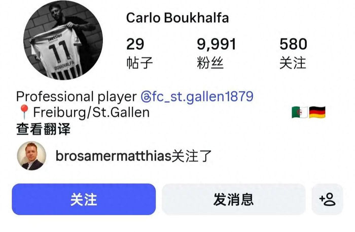 2026年1月9日,北京国安体育总监马永刚刚关注了来自瑞士超球队圣加伦的中场球员布哈勒法。从布哈纳法的社媒不难看到,北京国安新任体育总监马永明刚刚点了关注。按照中超以往的转会惯例,通常若一位新的外援要加盟某支中超球队,那么他本人就会提前关注这支球队,或者这支中超俱乐部的某位成员也会对他提前关注。