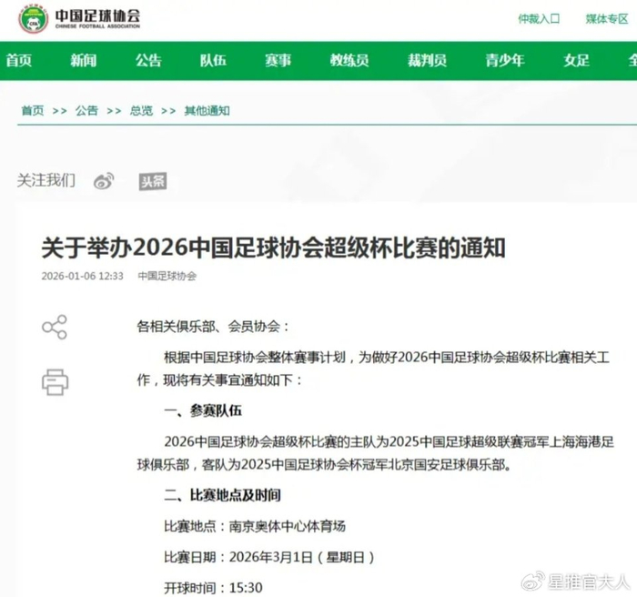 足协官网昨天发布了2026超级杯比赛的正式通知,与之前的消息不同的是,比赛日期改为3月1日进行,而且比赛时间也由晚上改成了下午。比赛地点不变,还是在南京奥体中心进行。此消息一出,最高兴的就是北京国安球迷了,这几乎意味着,北京国安新赛季的首冠或许要来了。