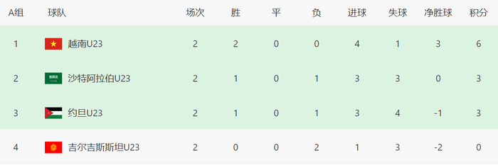 根据规则,同分情况下,优先比较胜负关系,所以越南队积6分也不能提前出线,因为最后一轮输给沙特队且约旦队击败吉尔吉斯斯坦队,这样越南队、沙特队、约旦队同积6分,需要比较相互净胜球和进球数。