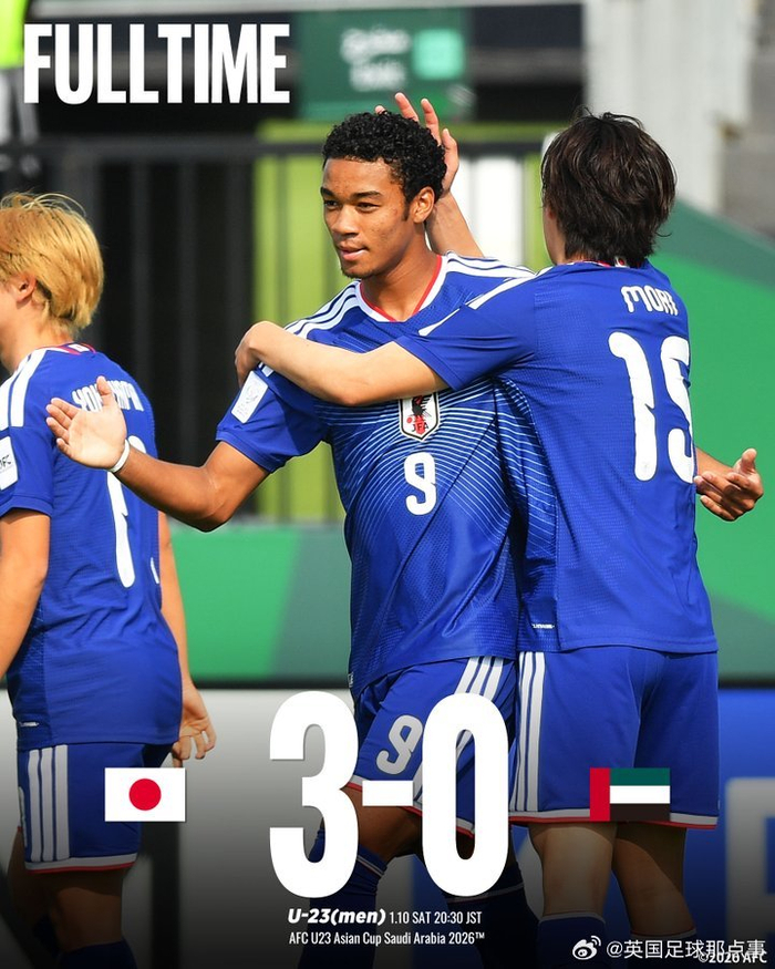又是一场完胜。日本U23以3-0轻取阿联酋,两轮打进8球,丢0球,继续小组第一,阿联酋全场只有1次射门。日本最后一轮对阵卡塔尔U23。#U23亚洲杯#