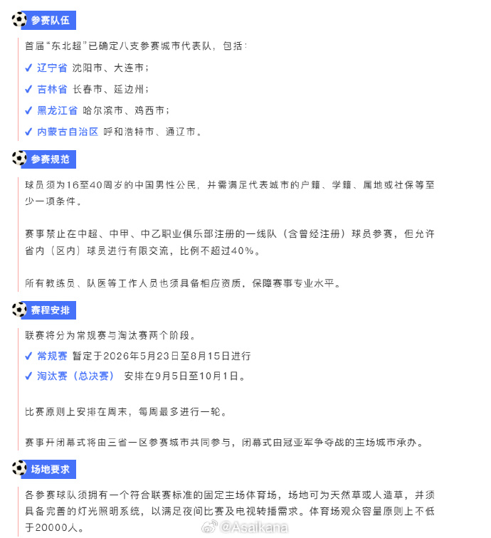 #首届东北超5月开赛#据中国吉林网吉刻新闻报道,东北地区城市足球联赛(简称“东北超”)已完成竞赛规程制定,计划于2026年5月正式启动。该项赛事由辽宁、吉林、黑龙江三省及内蒙古自治区体育局联合主办,各地足协承办,旨在以足球为纽带,激活区域体育活力,为东北足球发展注入全新动能。据悉,首届“东北超”已确定八支参赛城市代表队,包括:辽宁省沈阳市、大连市;吉林省长春市、延边州;黑龙江省哈尔滨市、鸡西市;内蒙古自治区呼和浩特市、通辽市。