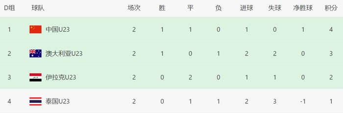 中国队积4分升至第一,澳大利亚队积3分掉到第二,伊拉克队积2分跌至第三,泰国队积1分仍居垫底。