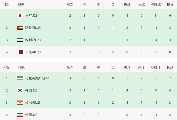 随着韩国0-2,伊朗0-1,U23亚洲杯最新排名:日本+越南头名出线