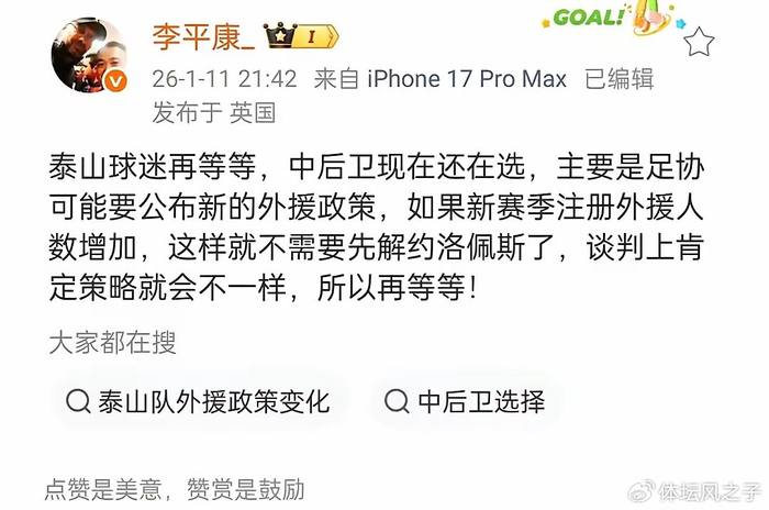 当下,泰山队已在海口集结开启冬训,教练组阵容也已确定,新增了两名西班牙助理教练,为球队的战术体系注入新的活力。但在中后卫外援这一关键位置上,却状况频出,引发了球迷和媒体的广泛关注,据知名媒体人李平康在社交媒体透露,关于新外援的问题,泰山队球迷还需耐心等待,中后卫仍在遴选当中。而这背后的主要原因是足协很可能公布新的外援政策。若新赛季注册外援人数增加,泰山队或许就无需先解约现有中卫外援洛佩斯,谈判策略也会随之改变。