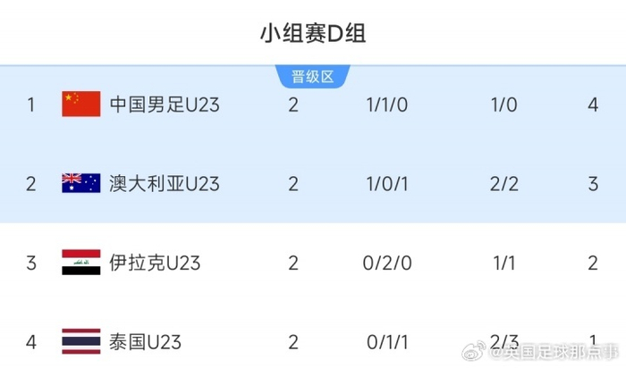 前两轮比赛,国足0-0战平伊拉克、1-0澳大利亚,积4分领跑小组;泰国U23积1分垫底。