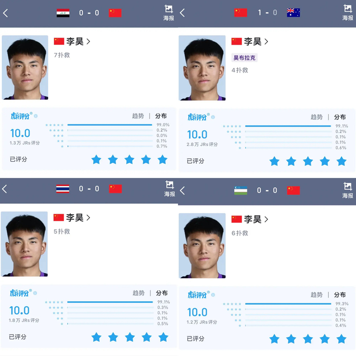 #u23国足晋级亚洲杯四强##u23国足4比2乌兹别克斯坦u23# U23亚洲杯已战至1/4决赛阶段,中国U23守门员李昊发挥神勇,4场比赛皆首发出战打满全场,淘汰赛面对乌兹别克斯坦点球大战关键扑点,并且全部比赛均收获虎扑JRs满分评分!