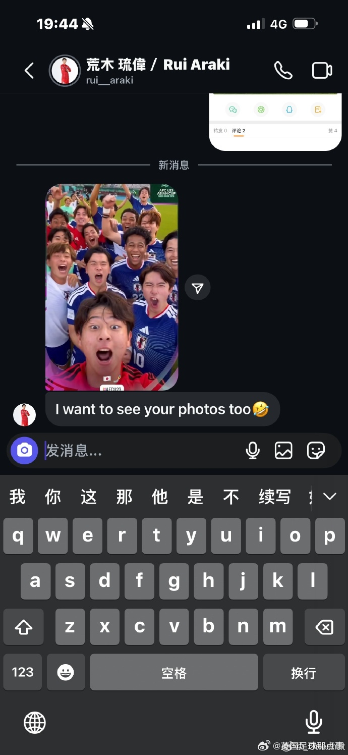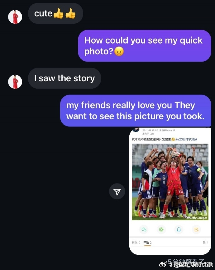 据该球迷介绍,她在昨天日本队晋级后关注了日本国脚荒木琉伟,对他的快拍评论“帅的”之后被对方主动私信。