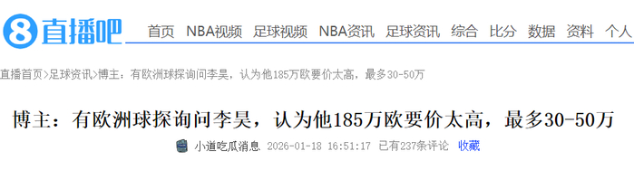 据博主“cheevo”的最新消息,来自欧洲的球探现场两次看完李昊的表现之后,也是愿意报价签下他。不过,这位球探认为李昊目前的185万欧的身价太高可能阻碍留洋,如果想去欧洲,欧洲球队能给的最高转会费在30-50万欧之间,最好能自由身加盟。