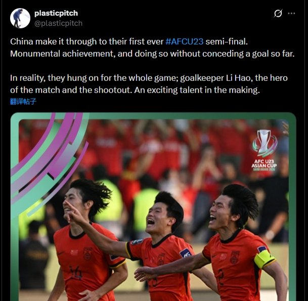 另据直播吧报道,U23亚洲杯1/4决赛,U23国足战胜乌兹别克斯坦U23,晋级4强。亚洲足球记者plasticpitch发文赞扬了U23国足。