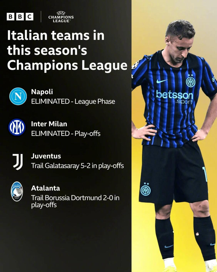 如果明夜出战的尤文和亚特兰大都没能翻盘,意甲就将面临没有球队晋级欧冠16强的尴尬局面。