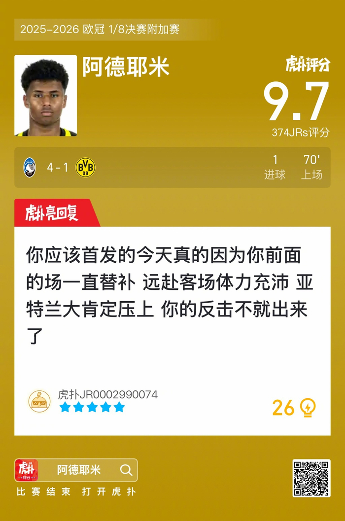 #亚特兰大4比1多特蒙德#阿德耶米打进一球,赛后收获9.7的虎扑评分!