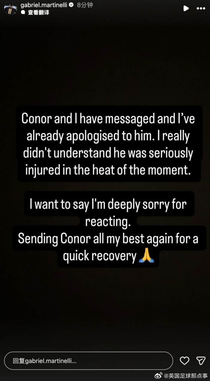 马丁内利向布拉德利致歉,表示自己当时并没有意识到对方受到重伤,并祝愿其早日康复🙏#阿森纳0比0利物浦#