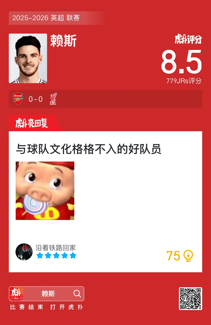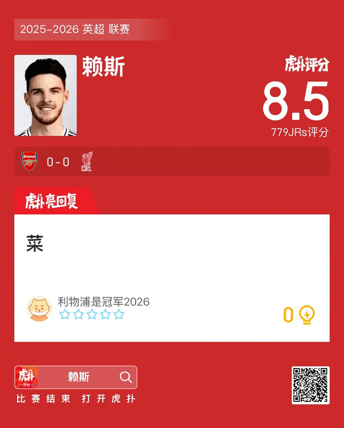 #阿森纳0比0利物浦#赖斯赛后收获8.5的虎扑评分!